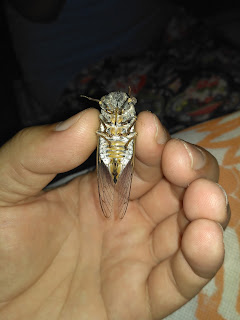 После такой красоты захотелось попить чай и поесть блинов со сгущенкой, что мы и устроили за нашим большим семейным столом. По ходу еще поймали цикаду, которая стрекочит целый день, вот такие они интересные на вид.